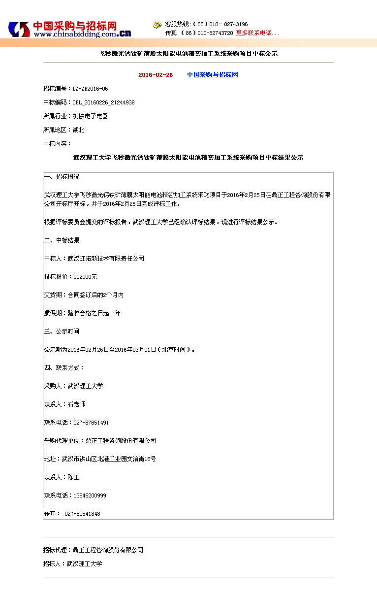 飛秒激光鈣鈦礦薄膜太陽能電池精密加工系統(tǒng)采購項目中標(biāo)公示