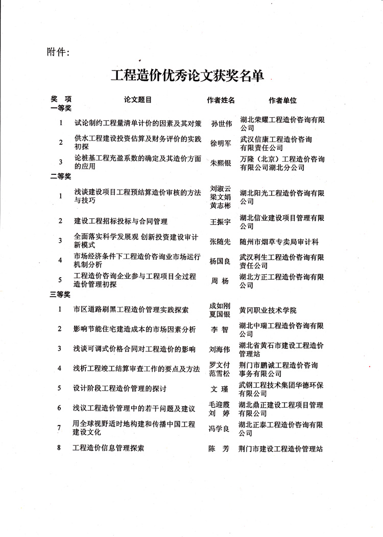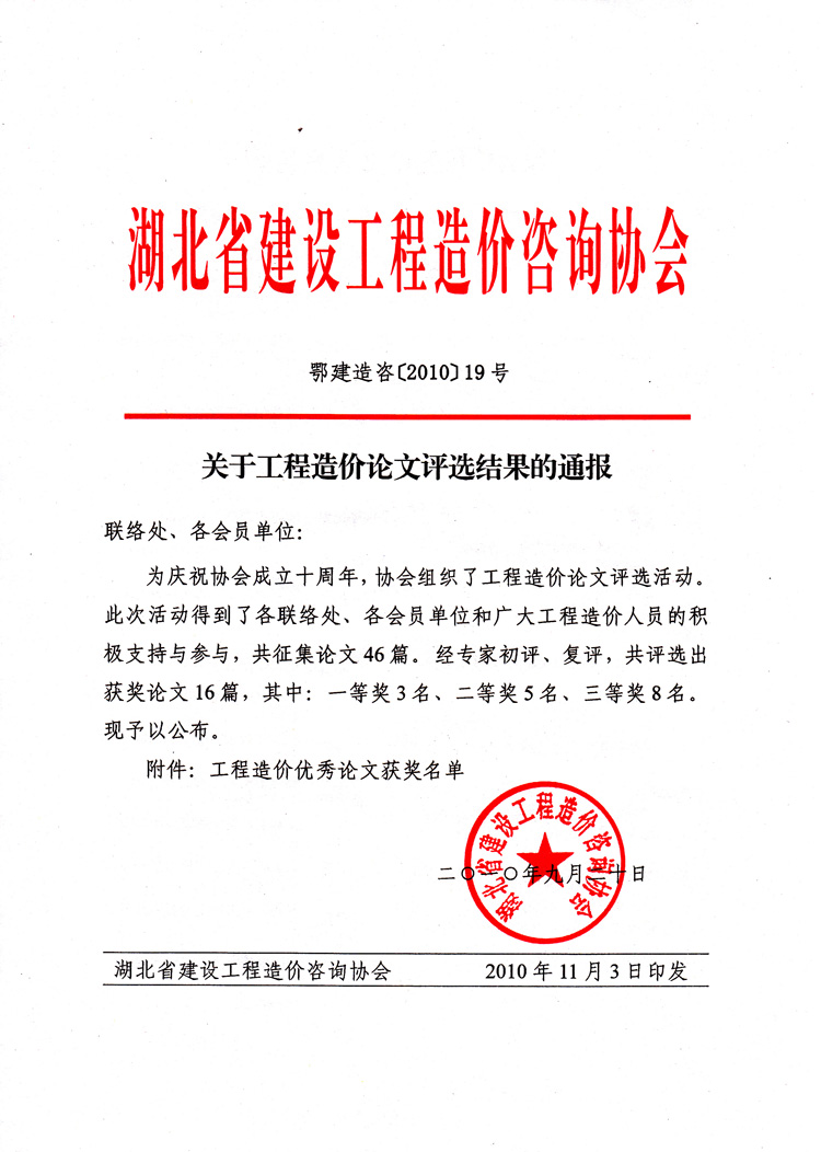 熱烈祝賀我公司在湖北省建設(shè)工程造價(jià)咨詢協(xié)會(huì)十周年之際舉辦的“工程造價(jià)論文評(píng)選活動(dòng)”中獲得三等獎(jiǎng)。