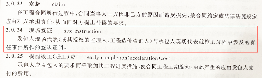 依據(jù)《建設工程工程量清單計價規(guī)范》(GB50500-2013)第2.0.24條對現(xiàn)場簽證的定義:“發(fā)包人現(xiàn)場代表與承包人現(xiàn)場代表就施工過程中涉及的責任事件所作的簽認證明。”