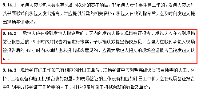 此外,第9.14.2條中,“......發(fā)包人在收到承包人現(xiàn)場簽報告后的48小時內(nèi)未確認也未提出修改意見的,應視為承包人提交的現(xiàn)場簽證報告已被發(fā)包人認可。”即,從時限來講,“48小時”亦非能夠滿足發(fā)包方充分詢價并與承包方定價的時長。