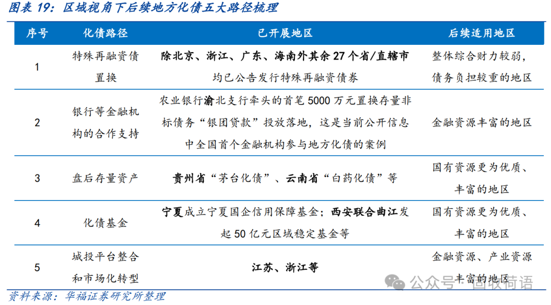 財(cái)政部《地方全口徑債務(wù)清查統(tǒng)計(jì)填報(bào)說(shuō)明》中提出六種常見(jiàn)的債務(wù)化解舉措,具體為(1)安排財(cái)政資金償還;(2)出讓政府股權(quán)以及經(jīng)營(yíng)性國(guó)有資產(chǎn)權(quán)益償還;(3)利用項(xiàng)目結(jié)轉(zhuǎn)資金、經(jīng)營(yíng)收入償還;(4)合規(guī)轉(zhuǎn)化為企業(yè)經(jīng)營(yíng)性債務(wù);(5)通過(guò)借新還舊、展期等方式償還;(6)采取破產(chǎn)重整或清算方式化解。同時(shí),根據(jù)各地化債動(dòng)態(tài)表述,各地根據(jù)自身情況,積極探索了金融機(jī)構(gòu)貸款置換、城投平臺(tái)整合或轉(zhuǎn)型、特殊再融資債置換、設(shè)立化債基金等方式推動(dòng)化債進(jìn)程。