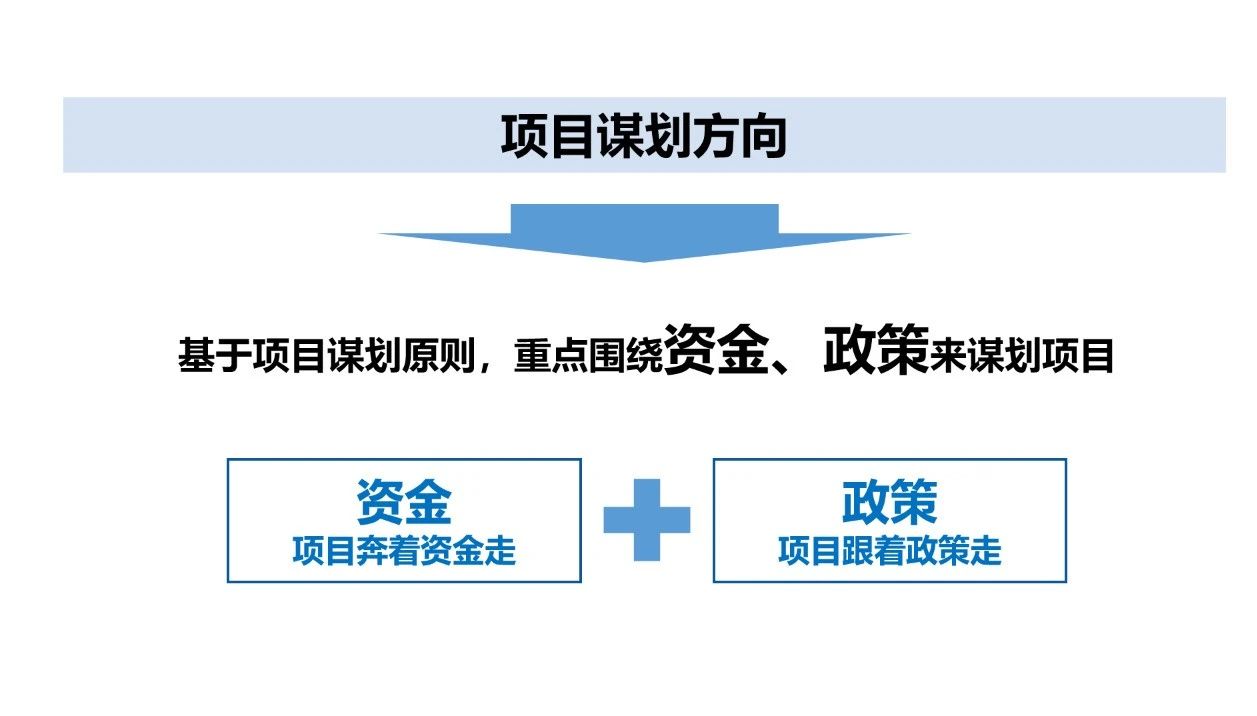 如果我們還是按照以前做項目的邏輯,那是很難獲得項目的資金支持。新形勢下,項目謀劃應該謀什么?彭總提出兩大項目謀劃方向,即項目奔著資金走和項目跟著政策走。