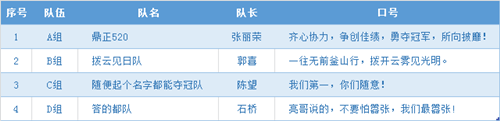 公司總部全員及分公司部分代表,共分為4個(gè)隊(duì)伍參賽。為保證全員參與且不受題目限制,全體員工跨部門分組,每組成員均由業(yè)務(wù)部門及非業(yè)務(wù)部門人員組成,最終分為A、B、C、D四組。